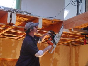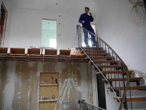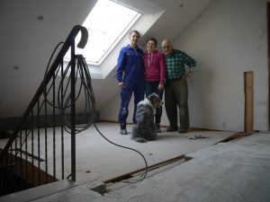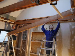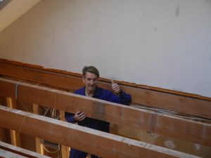 Letztes Wochenende haben wir dann einen richtig großen Schritt gemacht und die Balken im Dielen-Bereich entfernt. Früher waren das die Deckenbalken der Diele bzw. die Bodenbalken der kleinen Küche oben, die wir entfernt haben. Wir waren beeindruckt, wie gut alles geklappt hat (mit großem Dank an unseren Helfer Tom) und sind vom Ergebnis absolut begeistert! Wir haben jetzt eine richtige Eingangshalle mit Galerie, einfach großartig! Ich glaube, auf den Fotos kann man es ganz gut erkennen. Zurzeit bauen wir oben eine halbhohe Wand statt eines Geländers.