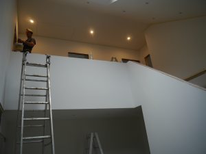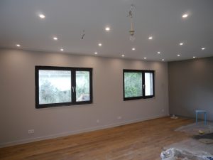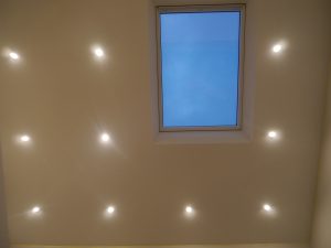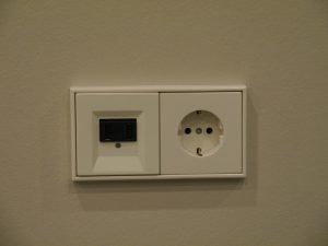 Die Elektrik in der Diele und im Wohn-Essbereich ist fertig, wir haben Schalter, Steckdosen und Lampen eingebaut. Die Schalter und Steckdosen sind von Jung, Serie LS990. Sieht schlicht aus und hochwertig. Wir haben auch eine USB-Steckdose eingebaut. Die Einbaustrahler sind LED-Lampen, zum Teil auch dimmbar. Wir haben über amazon bei sweet led und tevea die ultraflachen Einbaustrahler eingekauft. Für die Dachschräge haben wir schwenkbare Strahler gewählt.