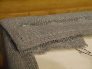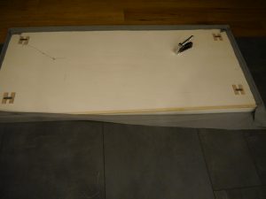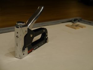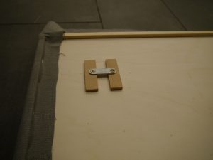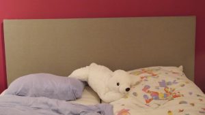 Wir haben uns eine 8mm Sperrholzplatte in der Bettbreite (180cm) und in einer Höhe von 80cm zuschneiden lassen. Auf eine Seite haben wir im selben Maß eine 5cm starke Schaumstoffplatte mit Sprühkleber aufgeklebt. Den Schaumstoff haben wir bei Schaumstoff Lübke zuschneiden lassen. Die bieten nicht nur einen guten Service, sondern leckere Kaffee- und Teespezialitäten und eine Menge Süßigkeiten, die man sich einfach nehmen darf (man wünscht sich heimlich, man müsste länger warten, damit man alles probieren kann, aber die Mitarbeiter sind auf Zack, man wird schnell bedient). Auf die Rückseite der Platte haben wir einen Rahmen aus einer 10×15 mm Rechteckleiste geklebt. Innerhalb des Rahmens hat Thomas dann viermal kleine Riegel montiert, damit man das Teil auf kleine Haken an die Wand hängen kann. Die Riegel sind genau auf der Höhe der Rahmenleiste, damit das Kopfteil gleichmäßig an der Wand anliegt. Man muss natürlich alles genau abmessen, wenn man die Löcher für die Haken in die Wand bohrt und es ist ein bisschen Gefummel, bis das Teil hängt, aber die Mühe hat sich gelohnt! Doch bevor wir das Teil montiert haben, musste natürlich noch der Stoff auf den Rahmen getackert werden. Wir haben die Platte einfach mit der Schaumstoffseite auf den Stoff gelegt und ihn dann zugeschnitten. Beim fest tackern sollte man zu zweit sein, einer achtet darauf, dass der Stoff leicht gespannt wird, der andere tackert. Hat ganz gut geklappt. Wir sind jedenfalls sehr zufrieden mit dem Ergebnis… und Juli zum Glück auch!